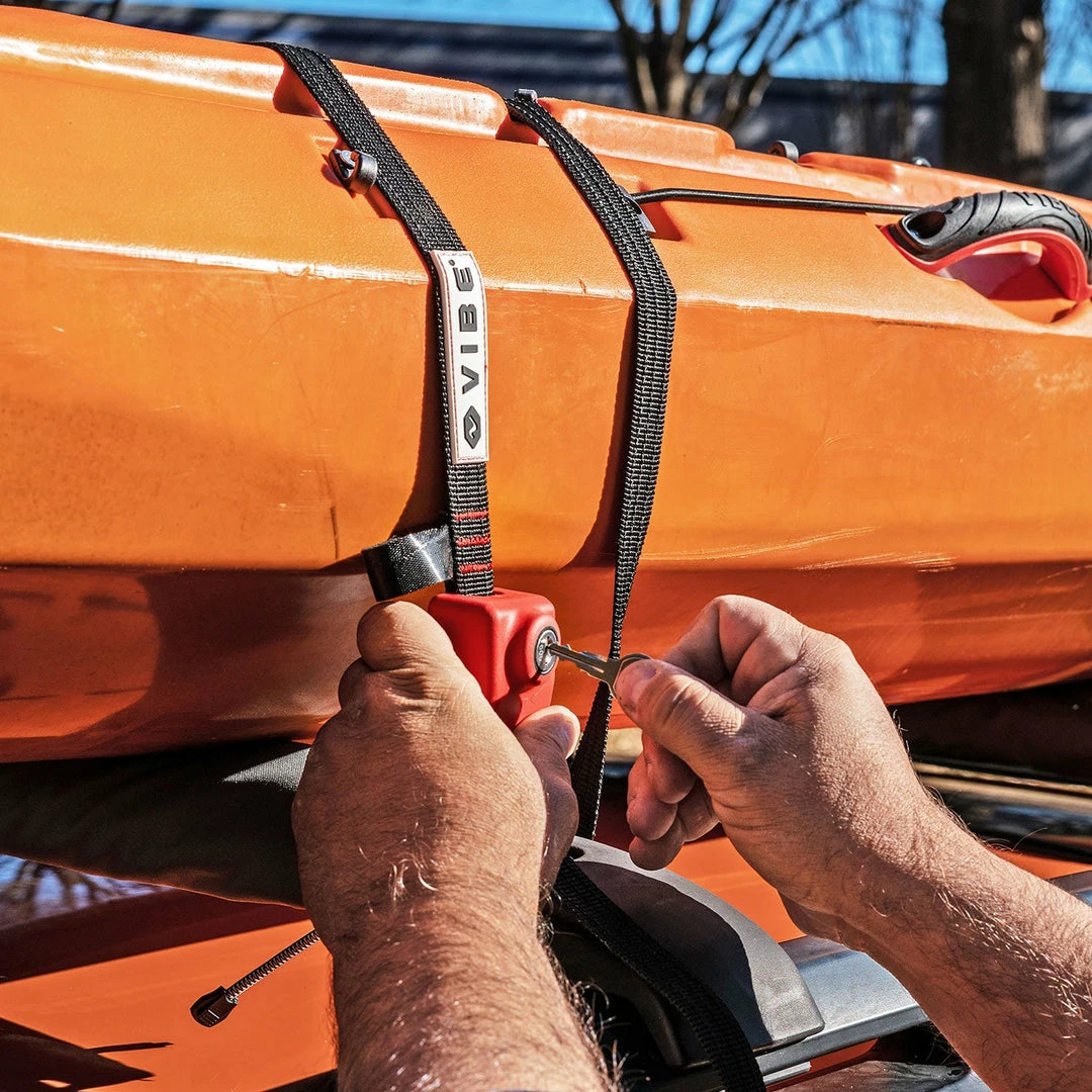 Our new 10′ Locking Cam Straps offer you some peace of mind when away from your precious kayak. Simply tighten down 2 straps over your boat, and secure to solid tie-downs on your vehicle or trailer, and rest easy knowing that the stainless steel reinforced strap and solid lock are keeping your gear safe!